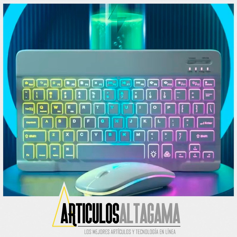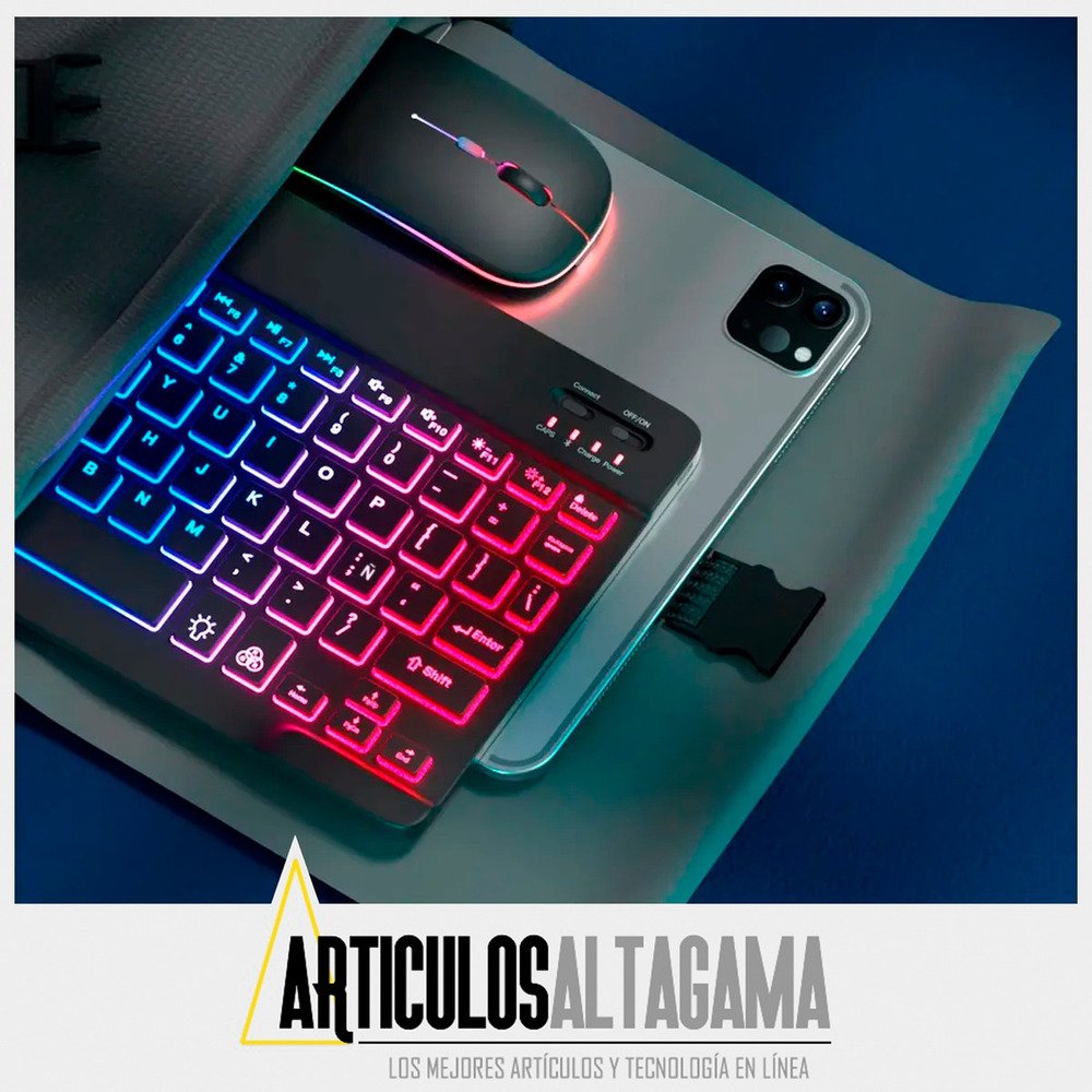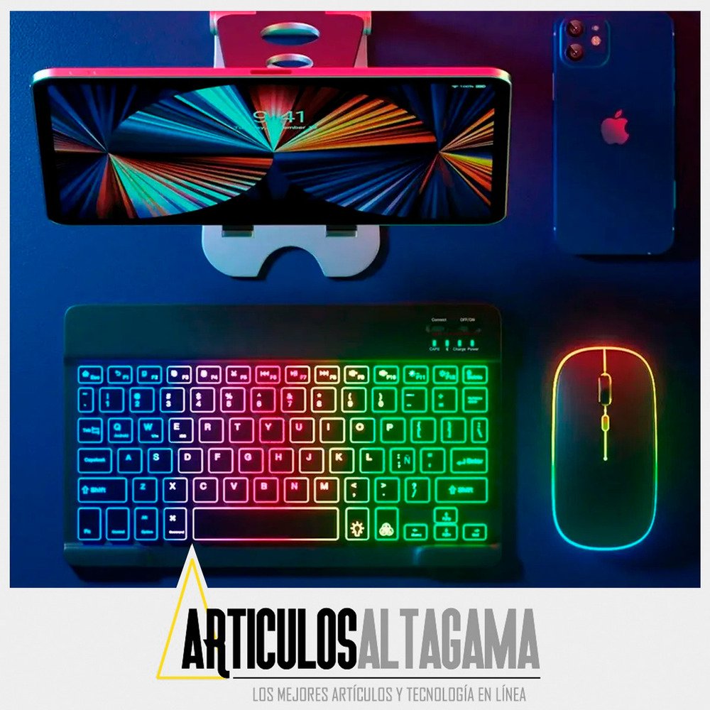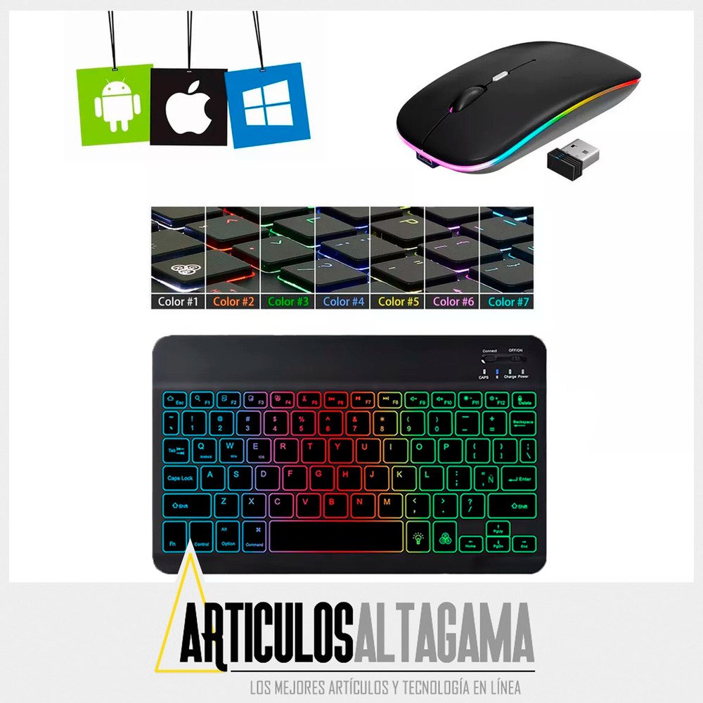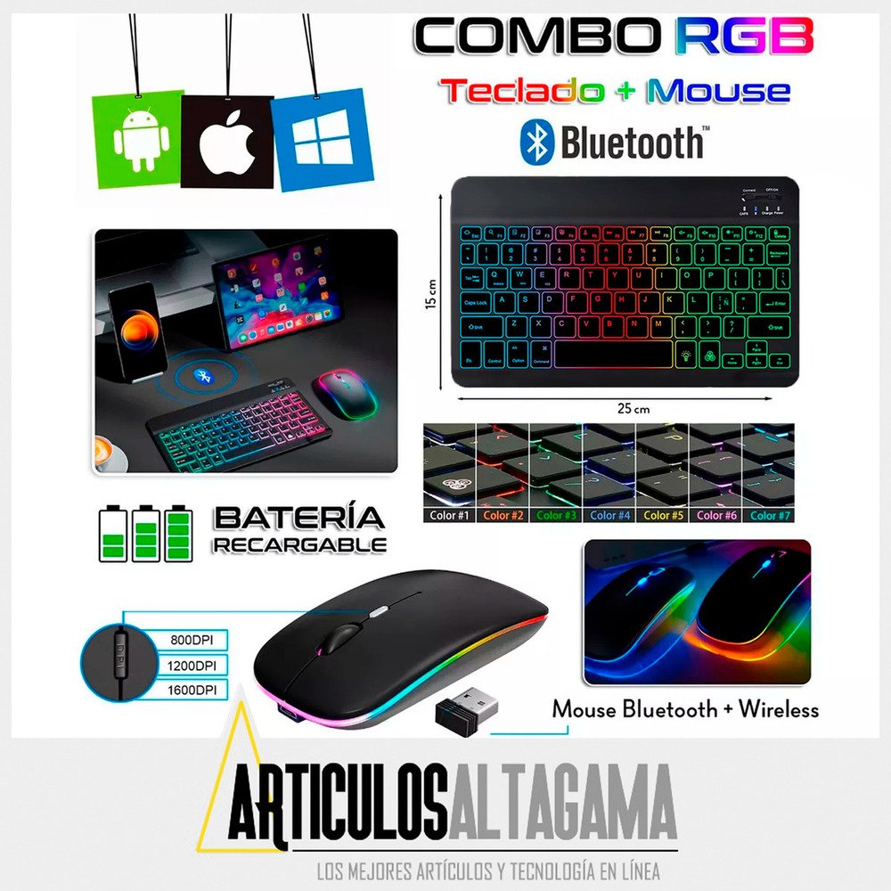 Con un diseño ultradelgado y elegante, este combo de teclado retroiluminado con función RGB y mouse inalámbrico 2 en 1 (Bluetooth y Wireless) es el compañero perfecto para tus dispositivos, ya sean tabletas o celulares con sistema operativo Mac, Android o Windows, también puedes usarlo con TV con estos sistemas operativos o puedes conectarlo en computadores para pasar presentaciones o manipularlo desde la distancia.