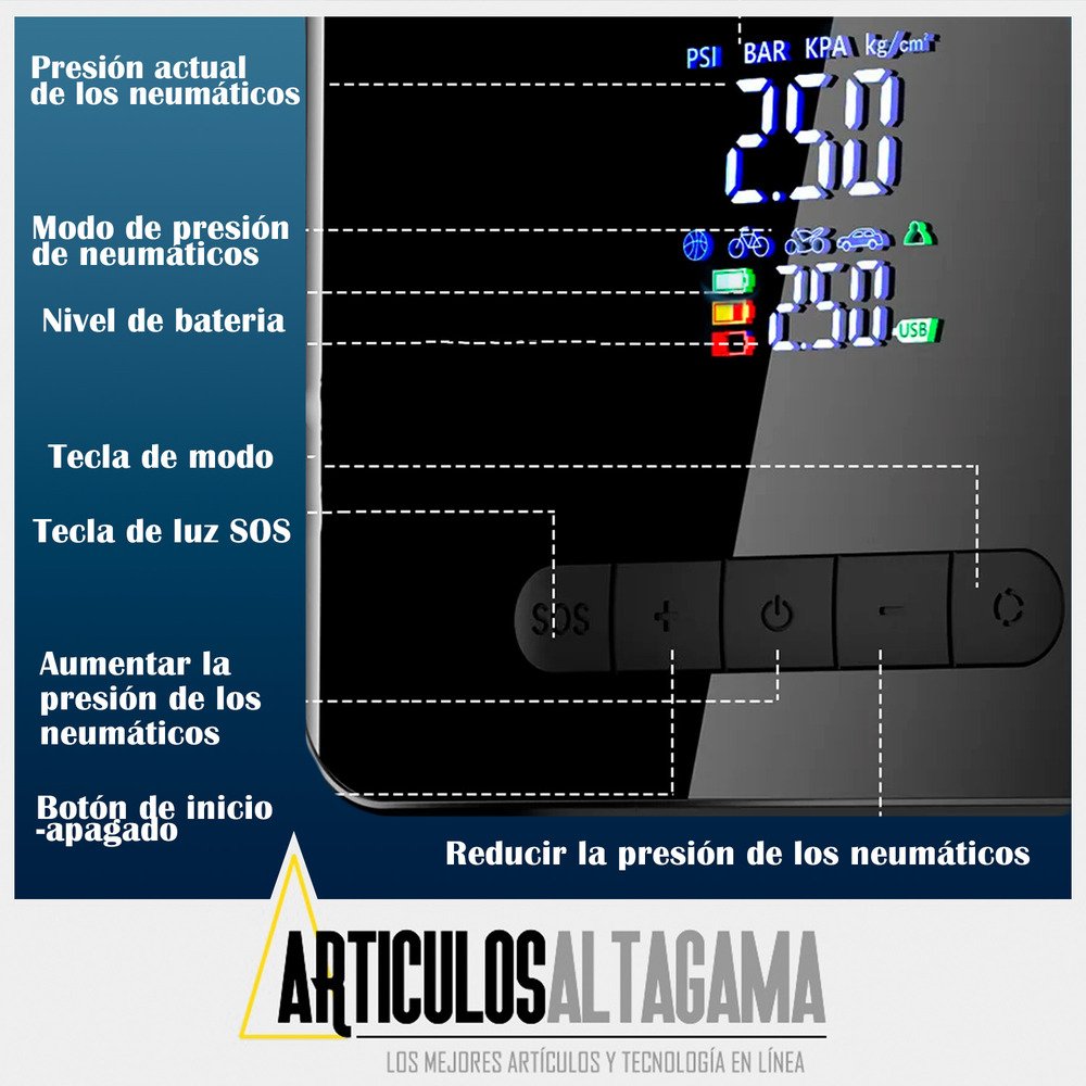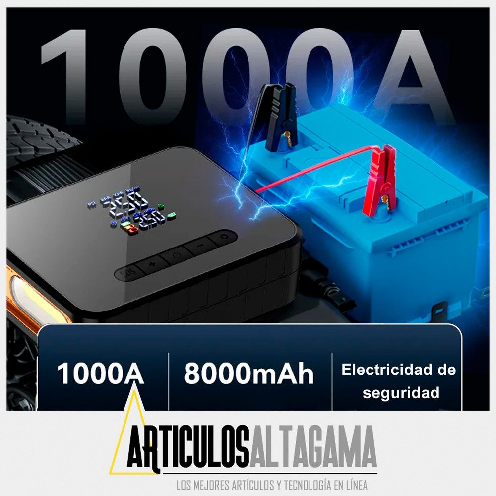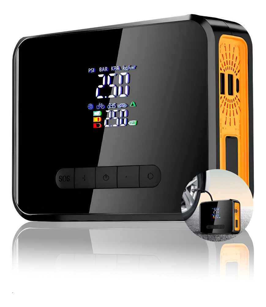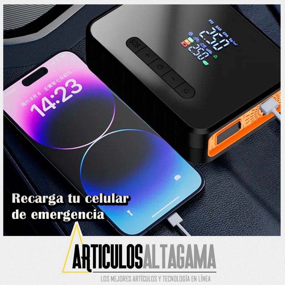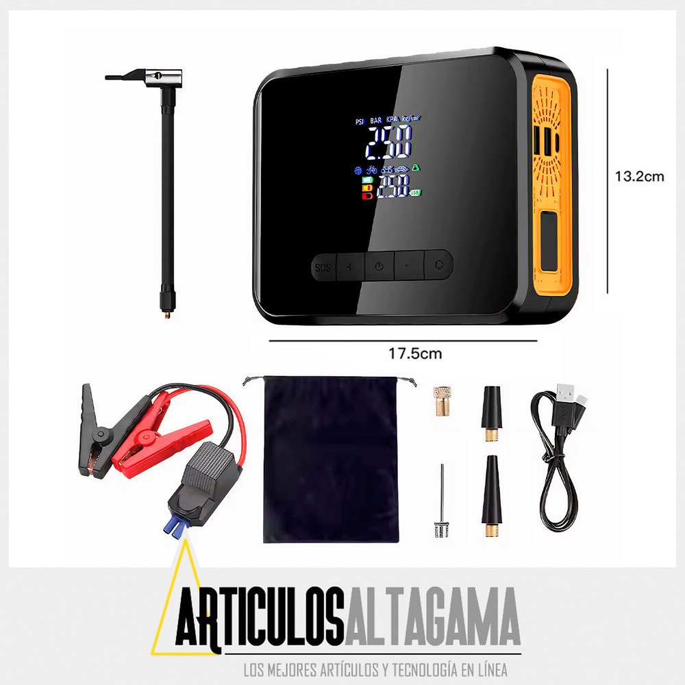 -Este es un producto que combina un arrancador de batería para automóvil y una bomba de inflado en uno. Puede arrancar automóviles que no pueden arrancar debido a un voltaje insuficiente, inflar un neumático y también admite una salida de 5 V/3 A para cargar la mayoría de los teléfonos celulares y tabletas.