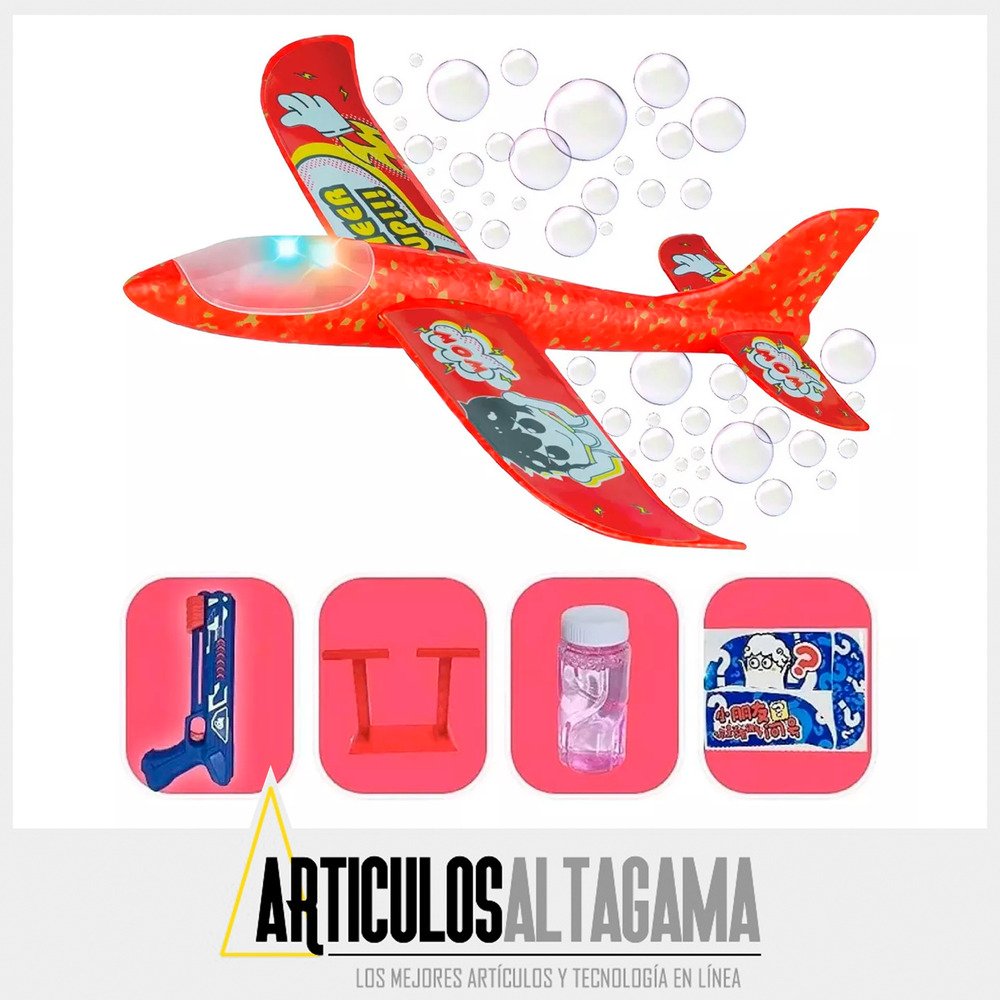 — El avión de juguete incluye un avión y un lanzador, un estante de burbujas y una botella de agua de burbujas. El avión rociará burbujas durante el deslizamiento, equipado con luces LED coloridas (interruptor de encendido/apagado), de día o de noche, los niños disfrutarán de actividades al aire libre.