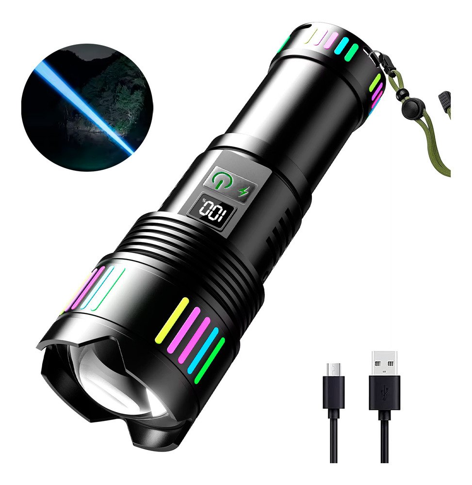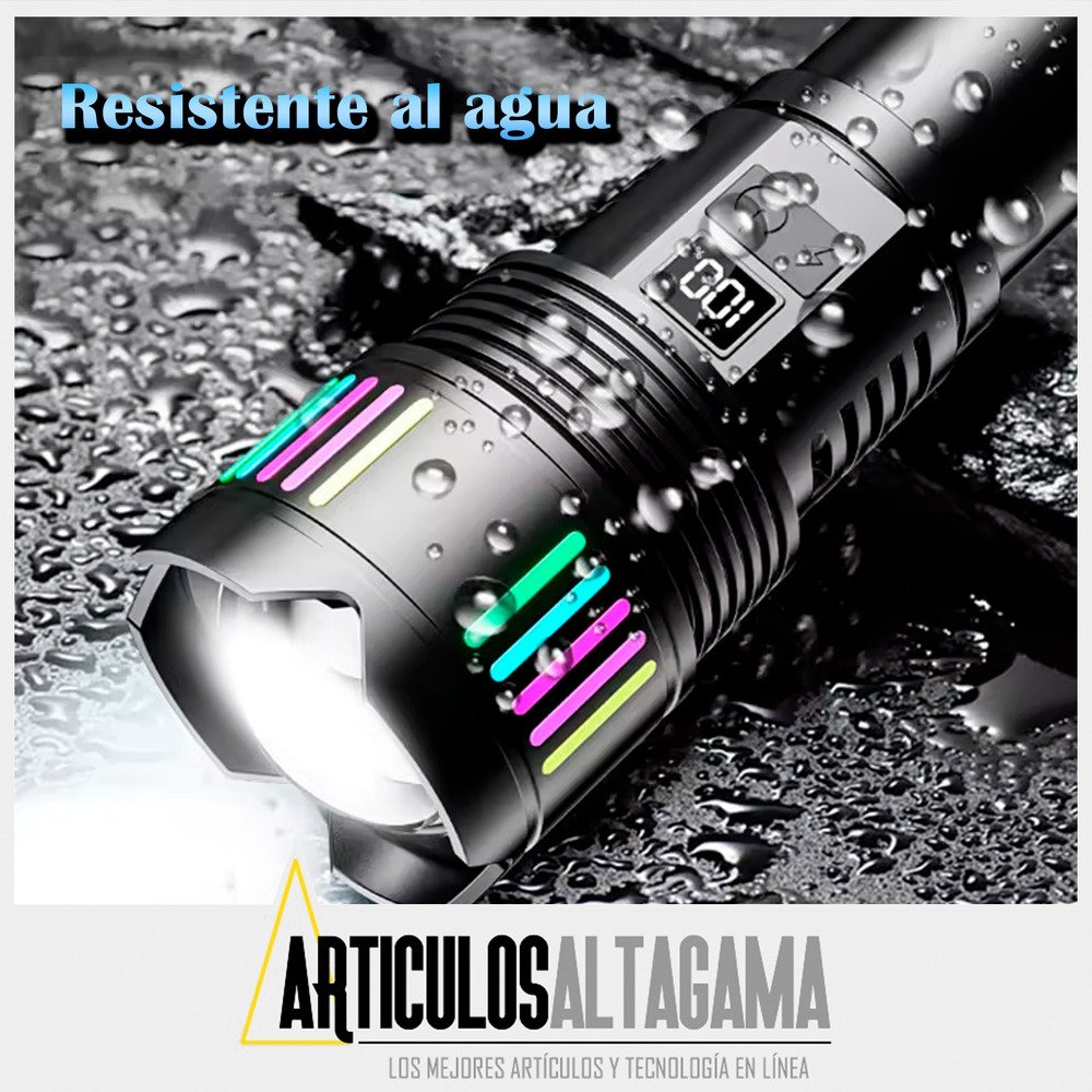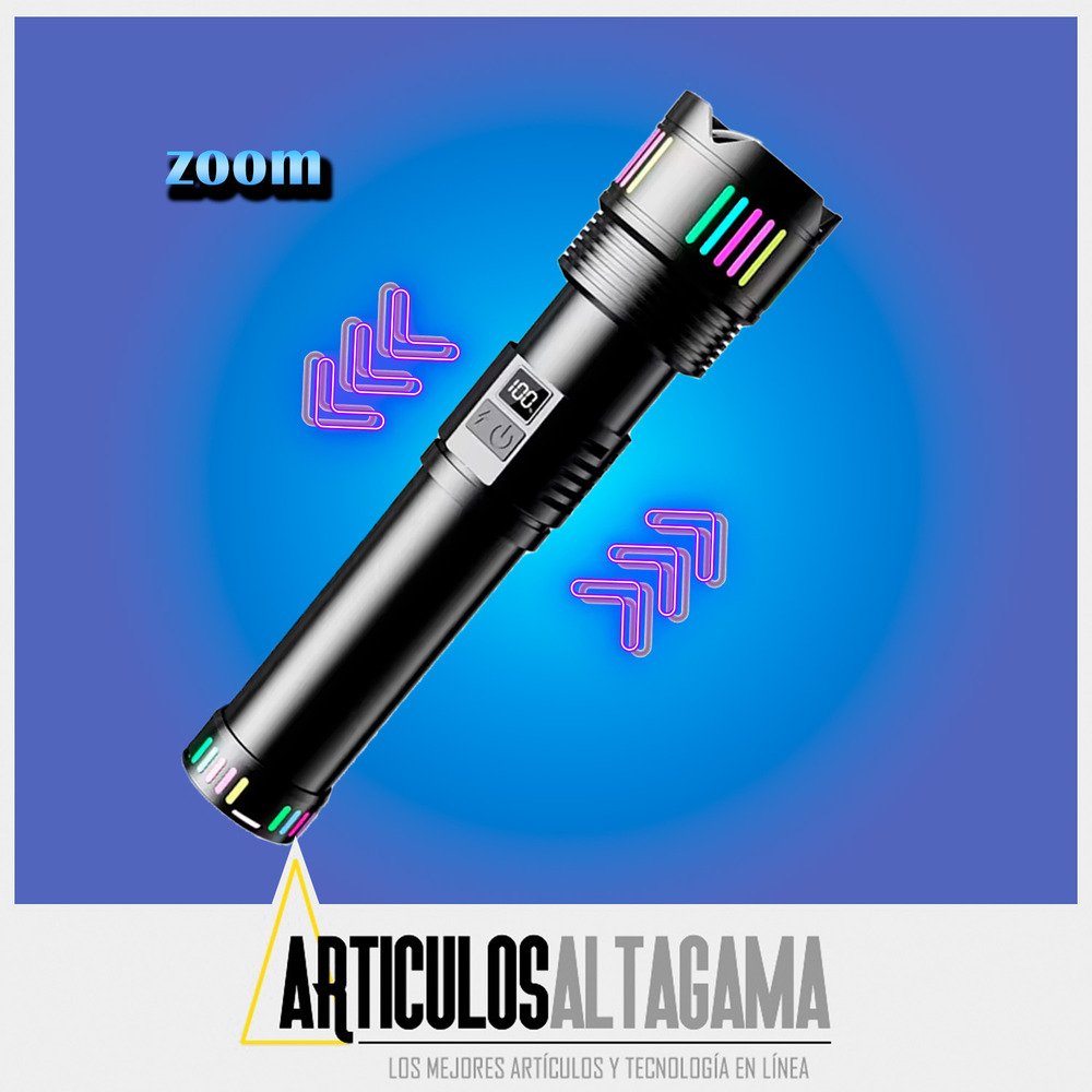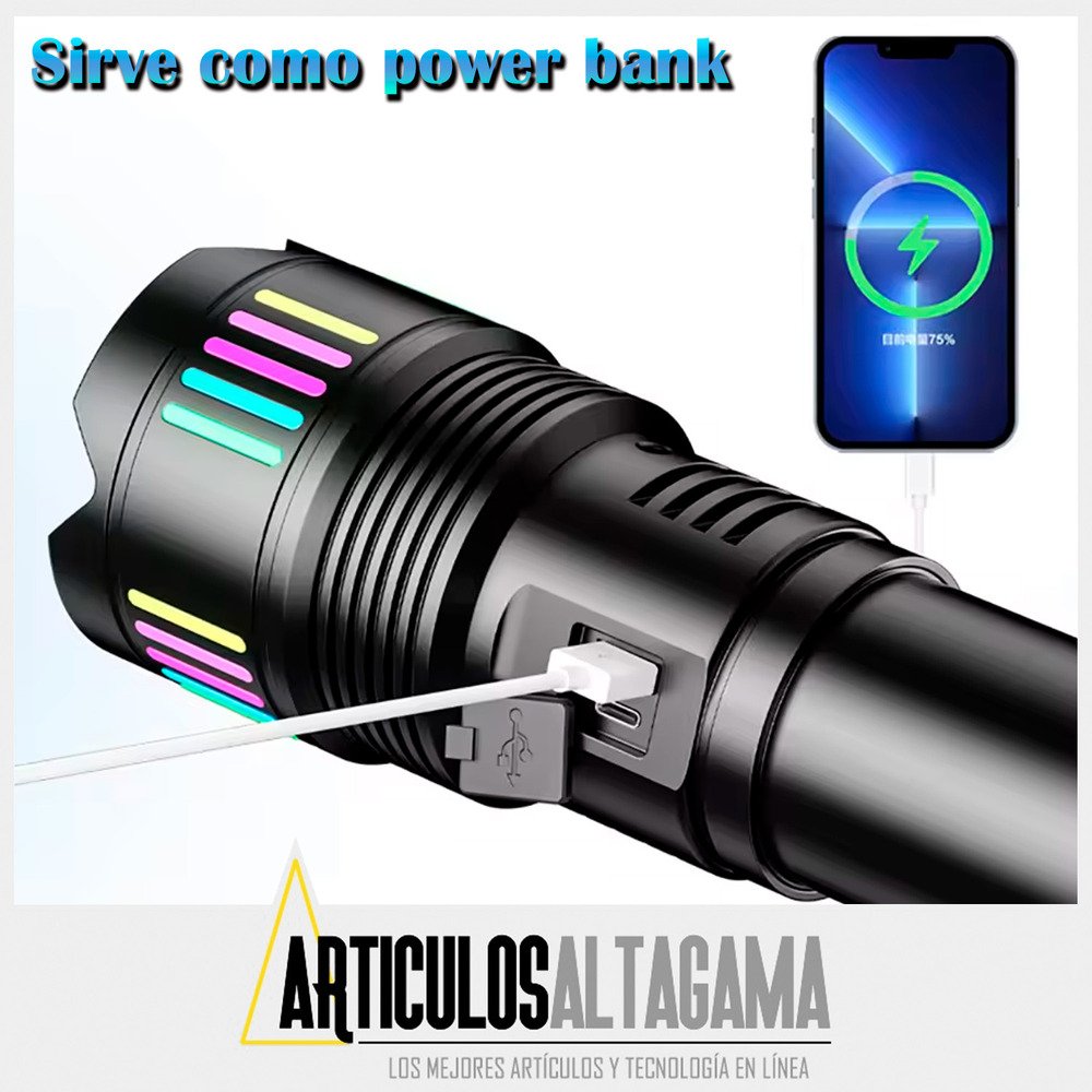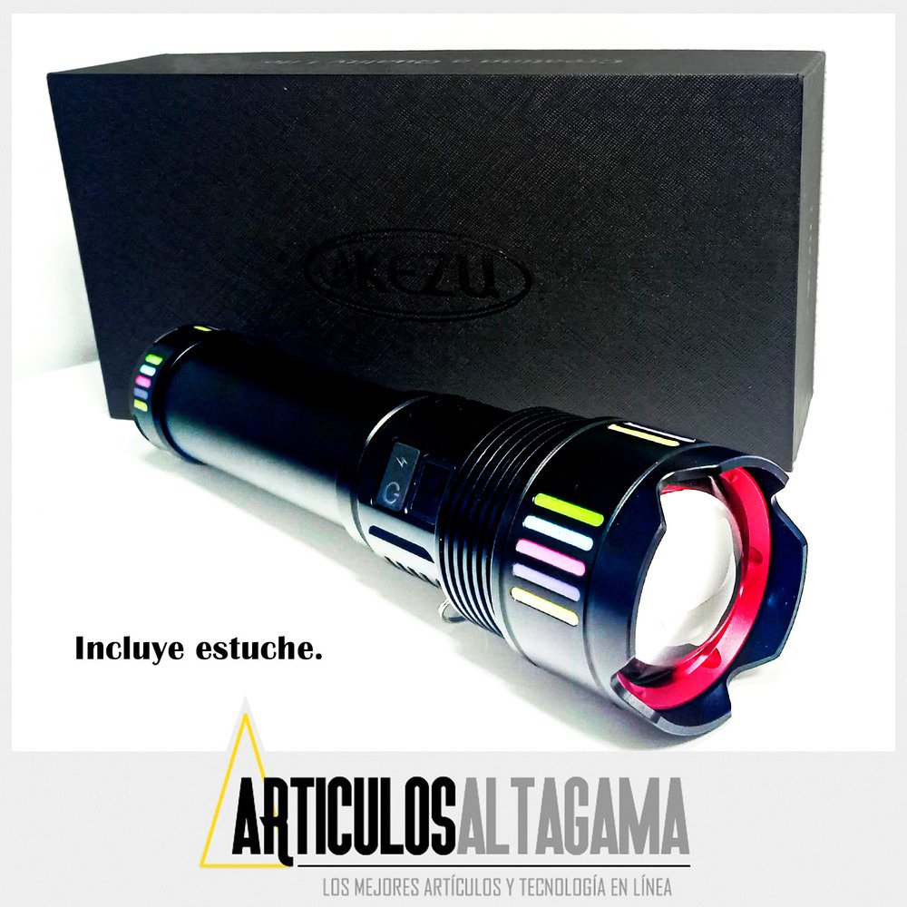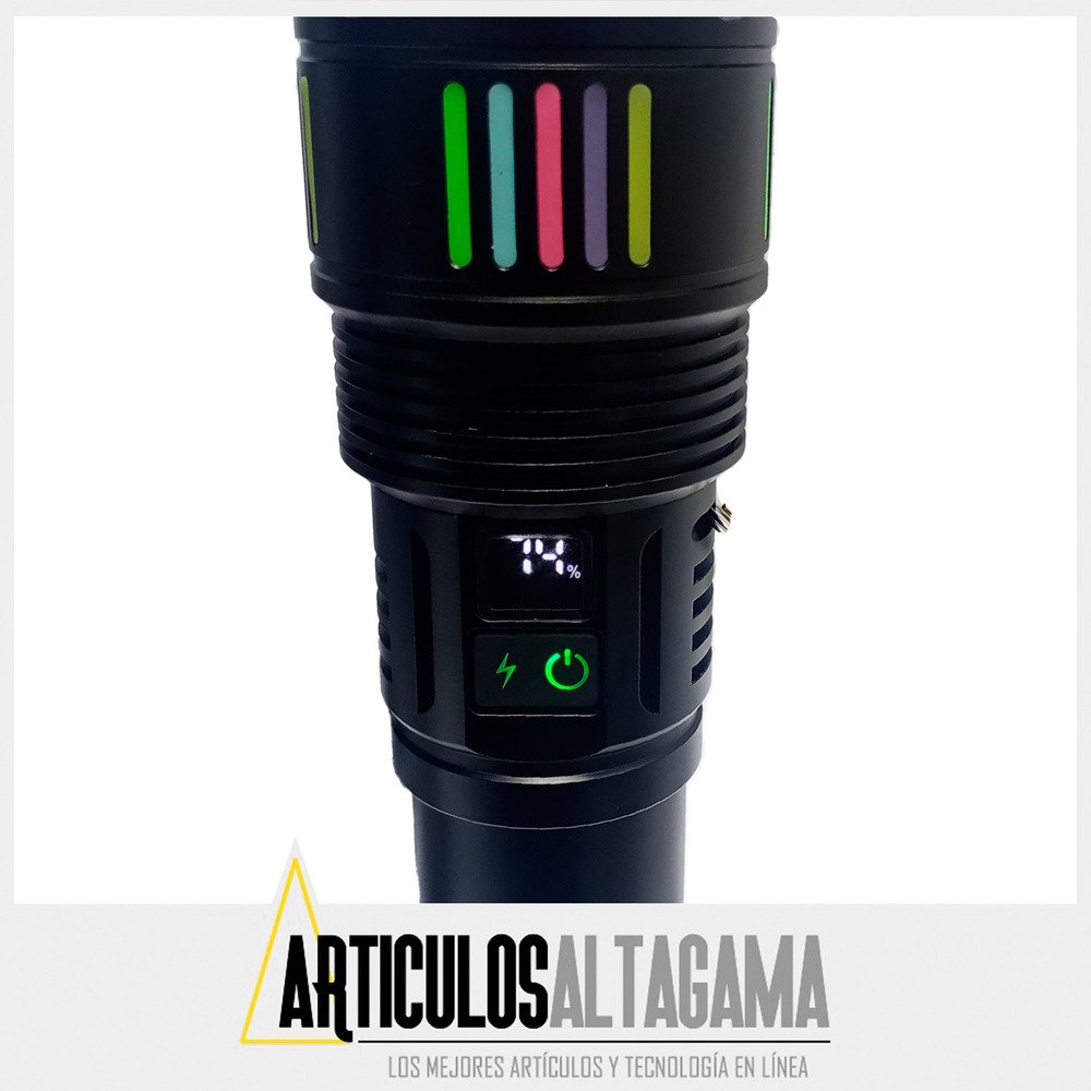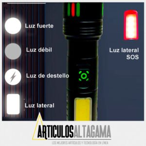 Una linterna portátil de iluminación que utiliza una fuente de energía recargable con batería, la cual cuenta con 5 modos de luz. Está diseñada para ser transportada y utilizada con facilidad en una variedad de entornos y situaciones, ofreciendo una fuente de luz práctica y accesible.
