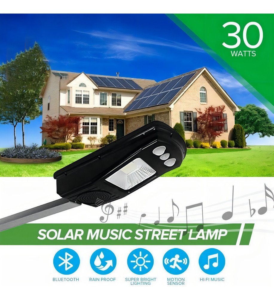 Este producto es una Luminaria Led Solar de 30W con Bluetooth y control remoto. La carcasa es de color negro y la luz es blanca.