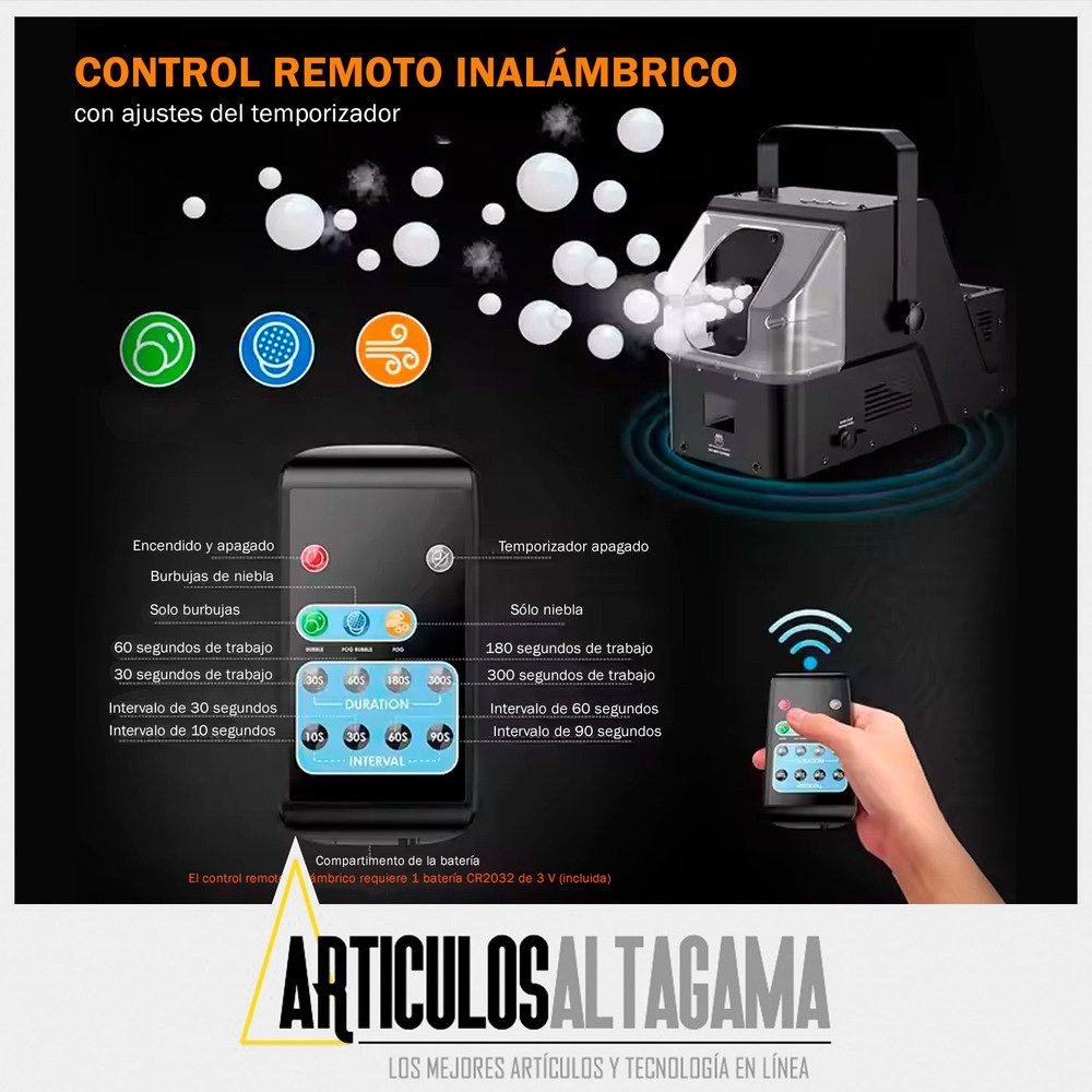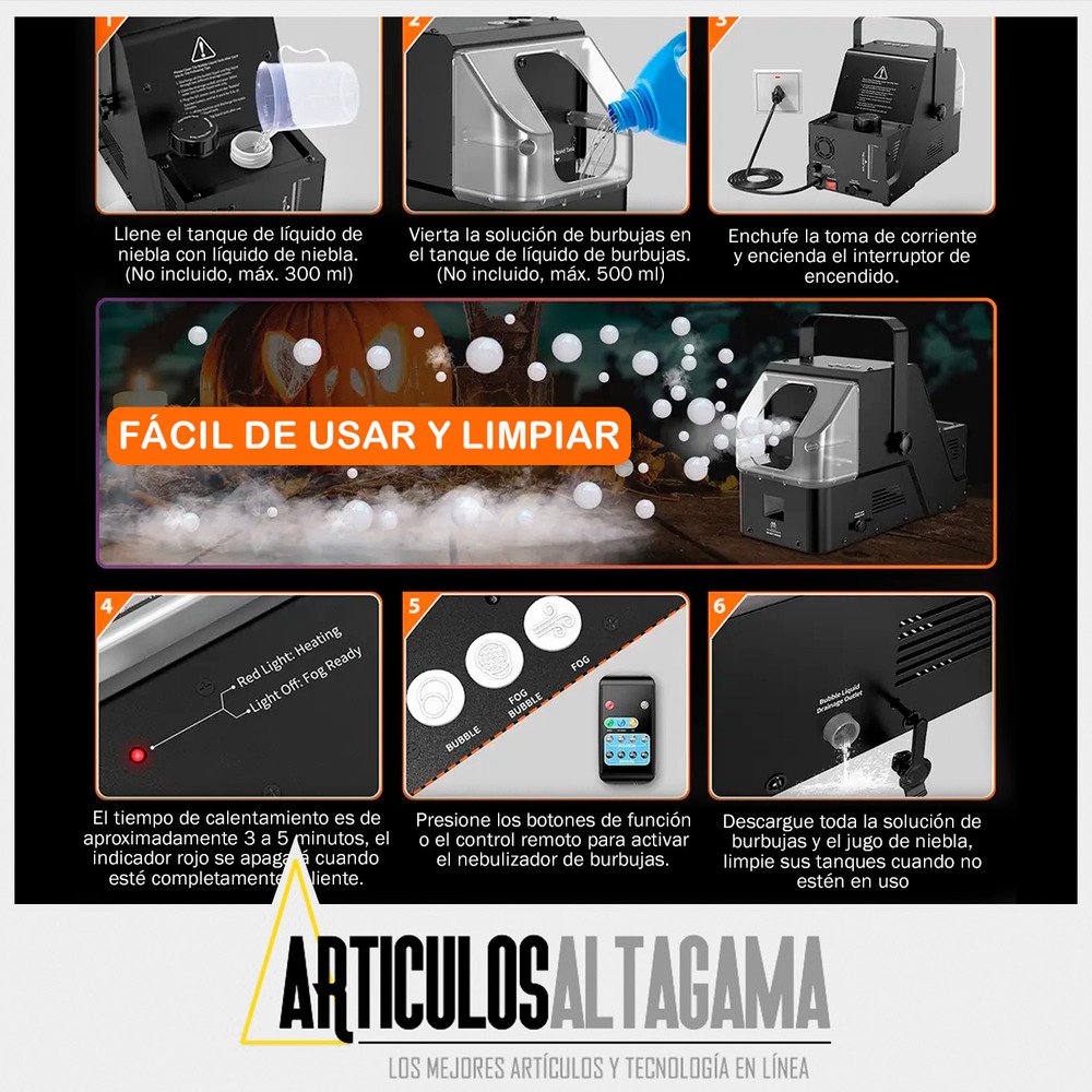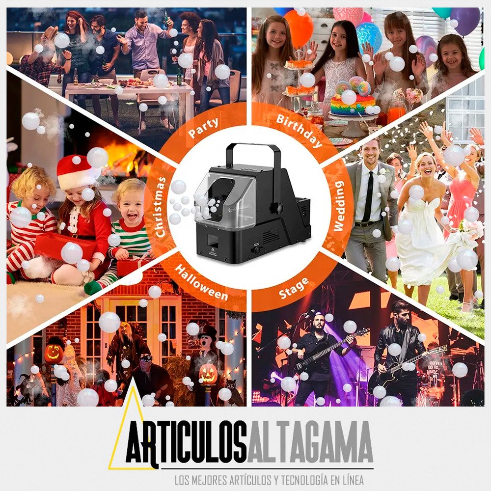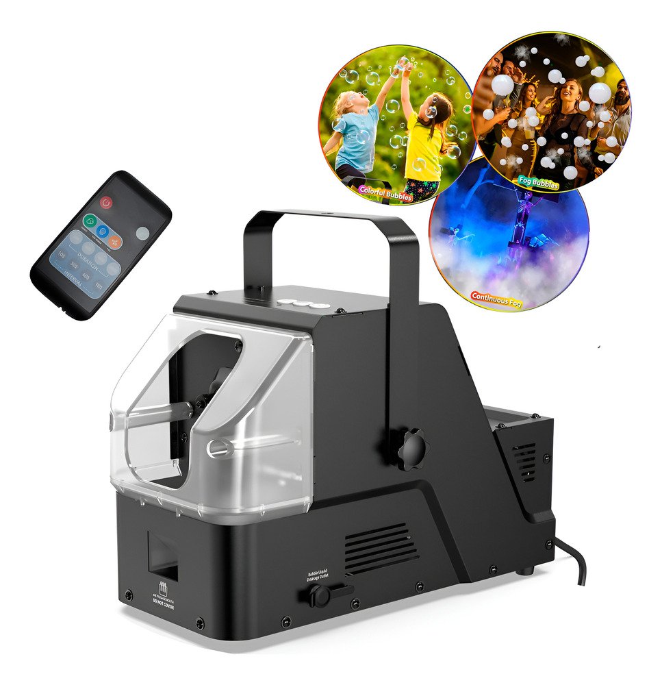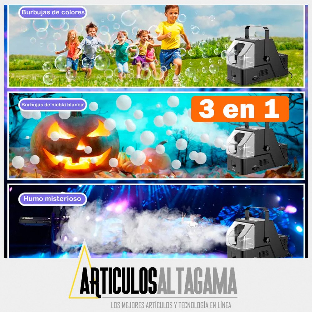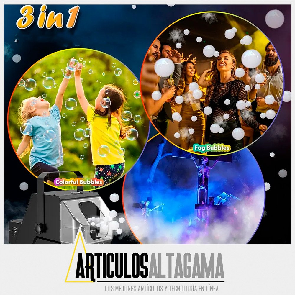 Este 3 en 1 es perfecto para cualquier celebración: desde burbujas encantadoras para fiestas infantiles que harán brillar los ojos de tus pequeños, hasta una niebla mágica ideal para Halloween y cumpleaños. Y eso no es todo: combina ambas funciones para crear un espectáculo fascinante de burbujas flotantes en un ambiente misterioso y festivo. ¡Haz que cada reunión temática sea un éxito rotundo y sorprende a tus invitados con esta experiencia única!