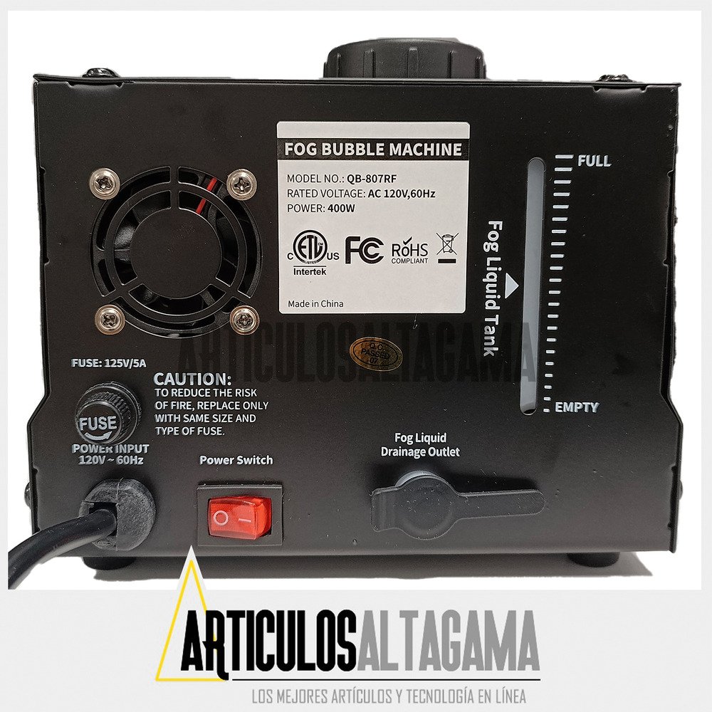 – Cómo rellenar los tanques: Localice la tapa del tanque de reserva en la parte posterior de la máquina de burbujas y desenrosquela. Llene el tanque de solución de niebla con el líquido de niebla adecuado (no incluido) y el tanque de solución de burbujas con el líquido de burbujas (no incluido). Asegúrese de llenar los tanques adecuadamente, pero no exceda la capacidad máxima.