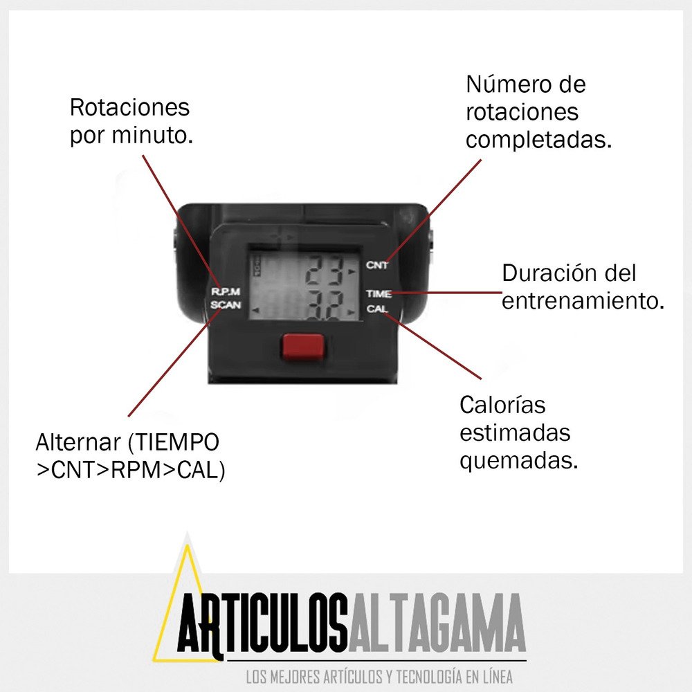 – Incluye una pantalla con 5 funciones que muestra tiempo de ejercicio, número de revoluciones, ciclos, revoluciones por minuto (RPM) y calorías quemadas.
