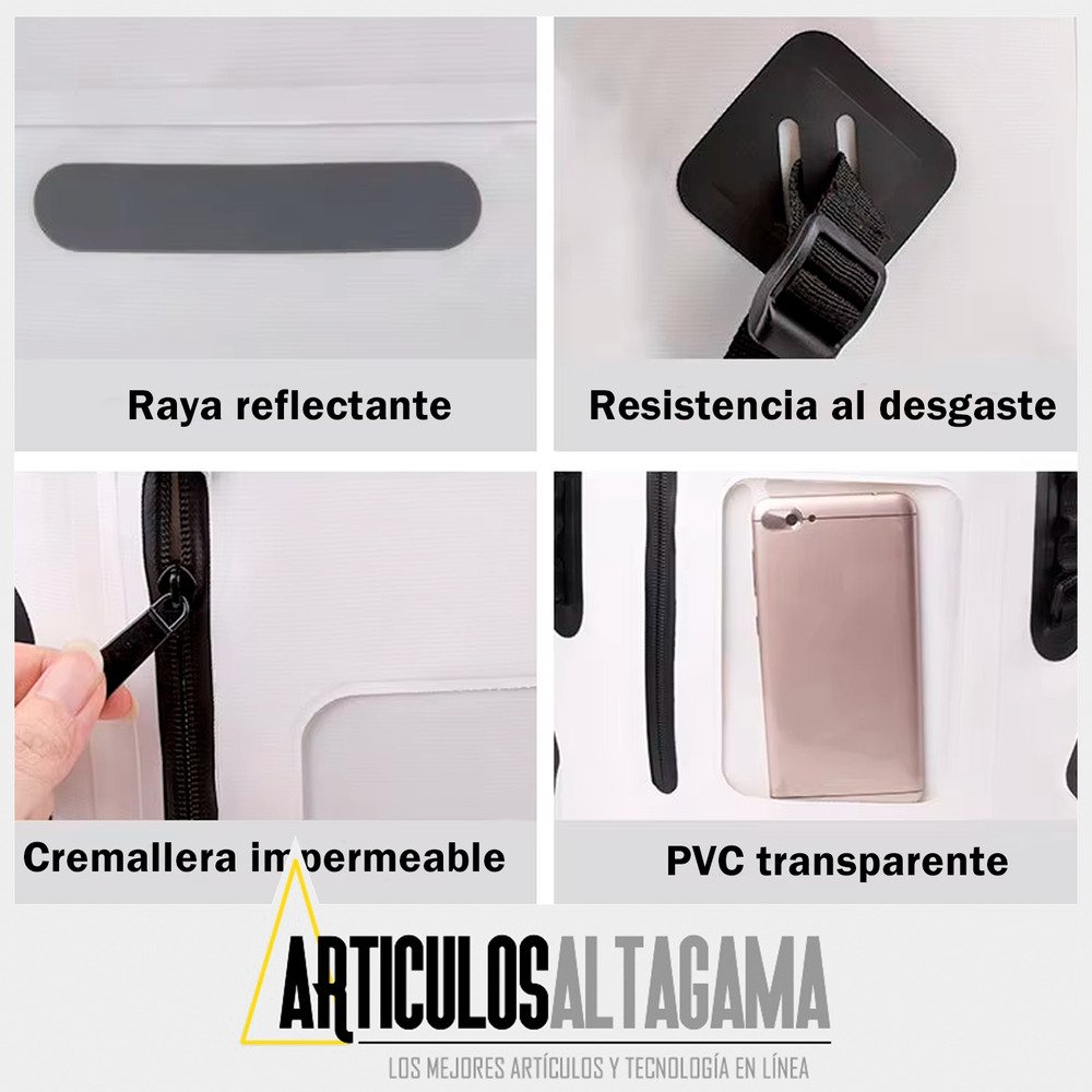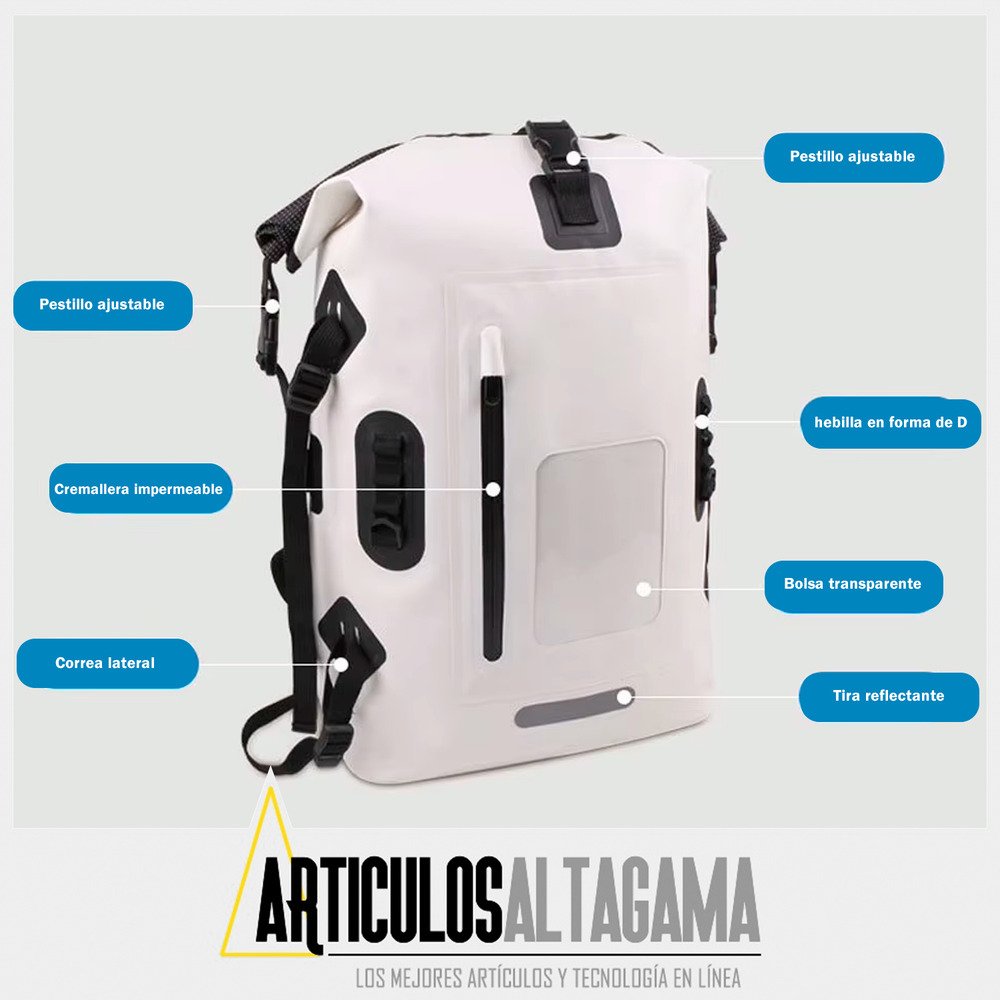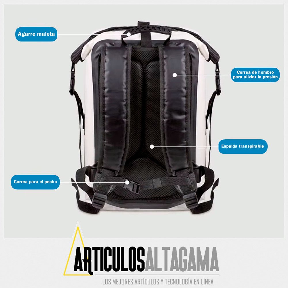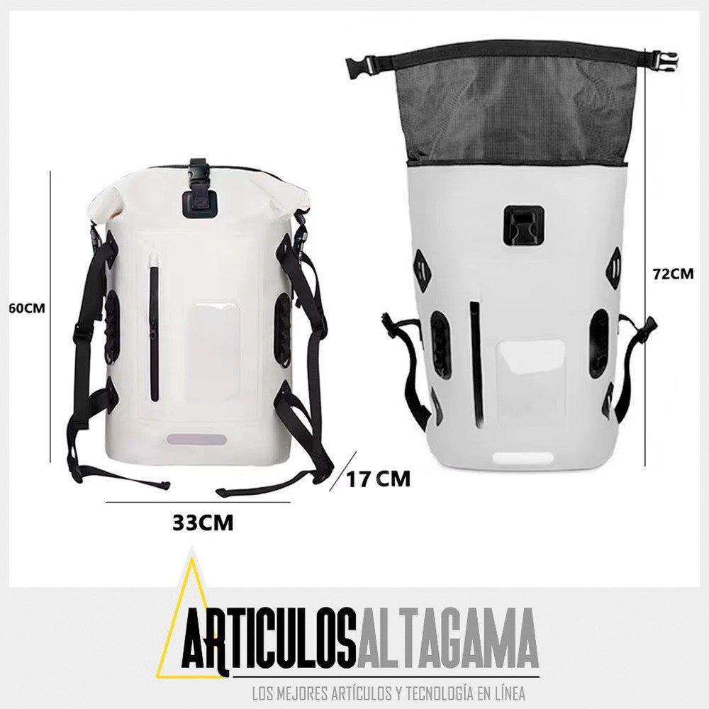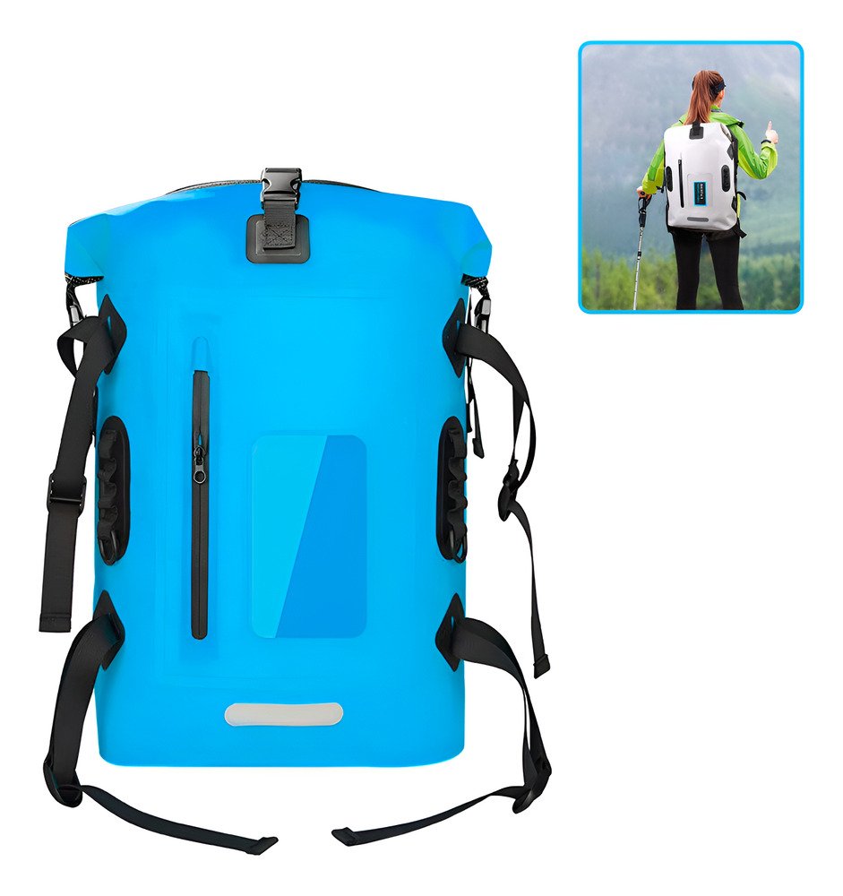La mochila perfecta para todas tus aventuras al aire libre, ya sea camping, natación o cualquier actividad en la que necesites proteger tus pertenencias de la humedad, agua o de las altas temperaturas. Con una impresionante capacidad de 30 litros, te ofrece amplio espacio para guardar todo lo necesario sin sacrificar comodidad ni estilo. Su diseño resistente y funcional asegura que tus objetos permanezcan secos y seguros, sin importar el clima o el entorno.