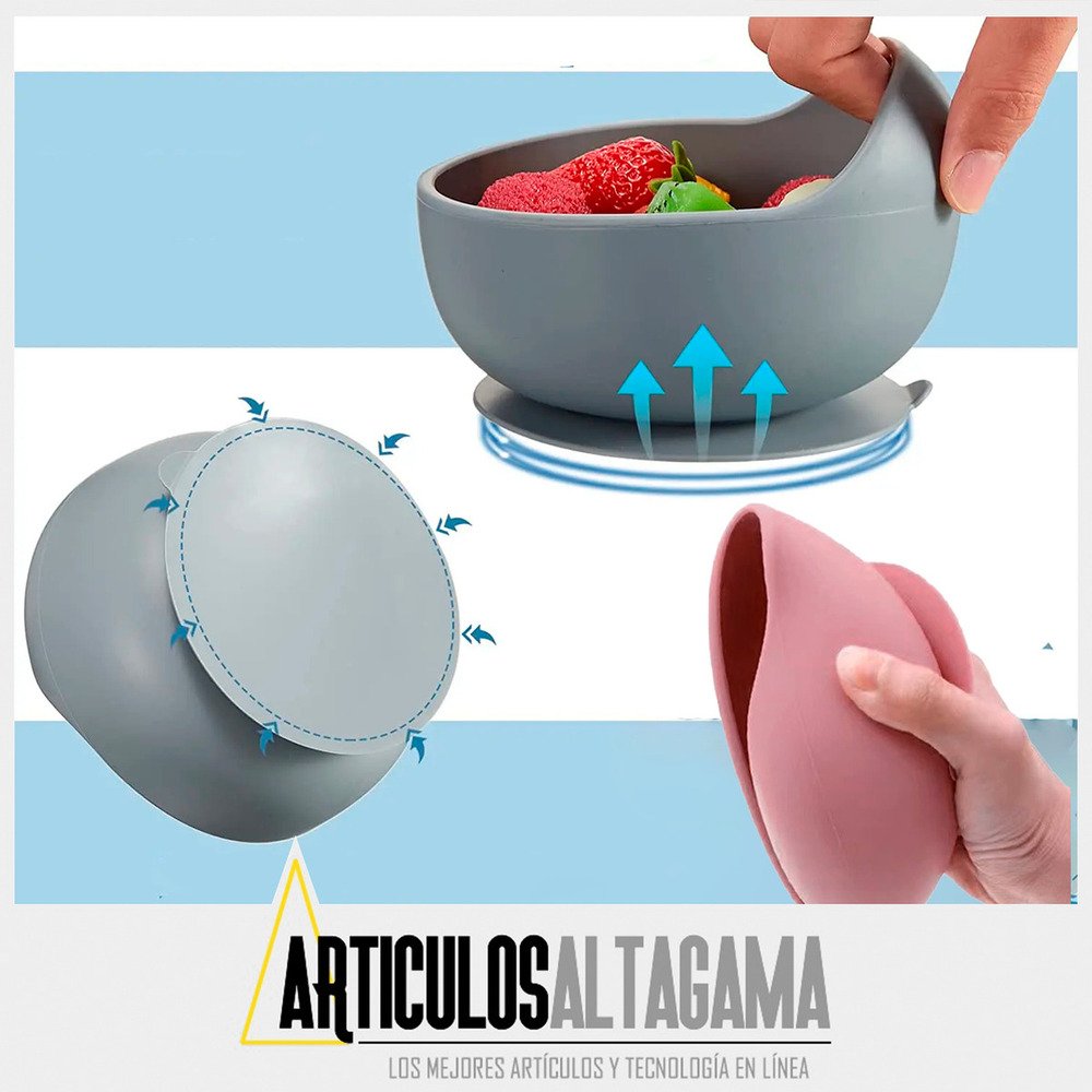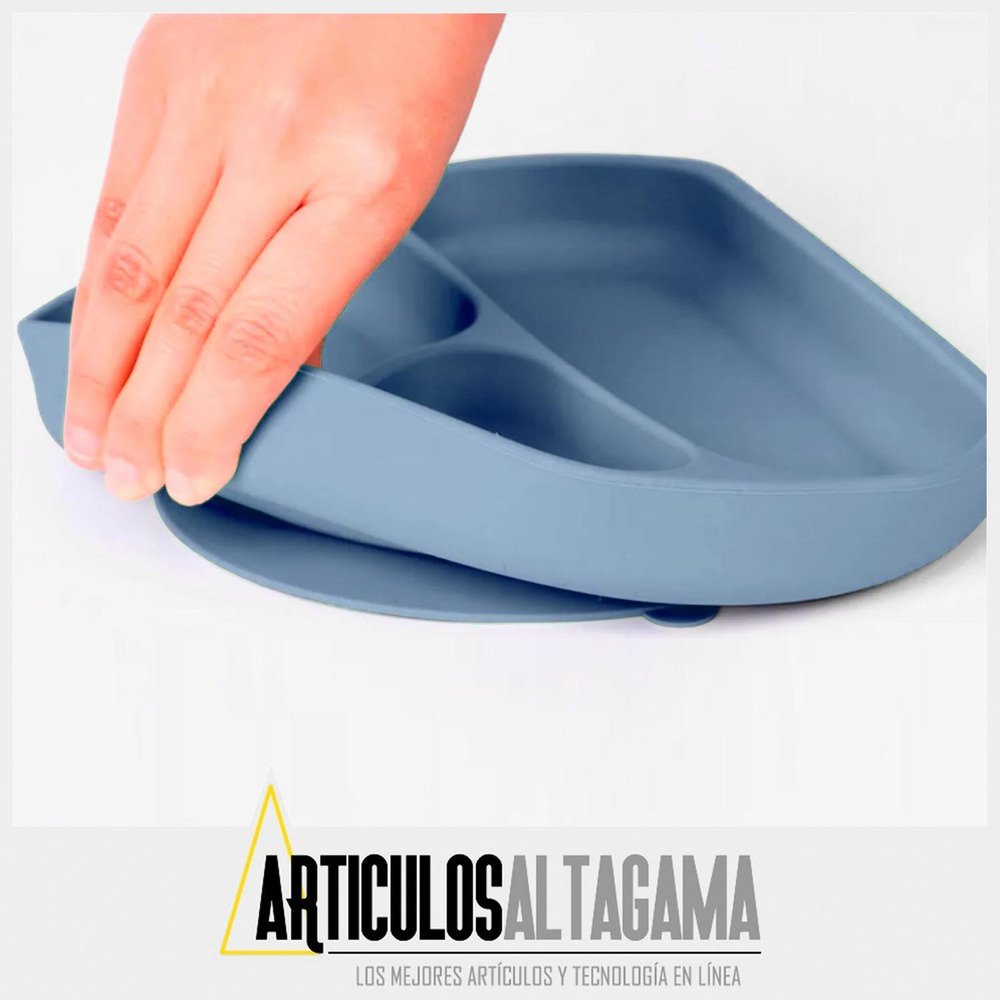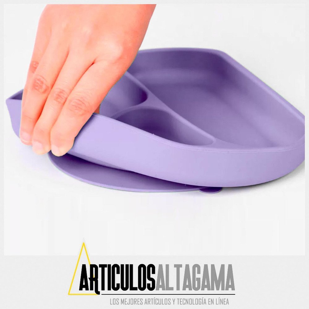 – El plato con divisiones y el plato hondo cuentan con ventosa de succión para adherirlo al vidrio de la mesa o a cualquier superficie plana y lisa para evitar derrames accidentales