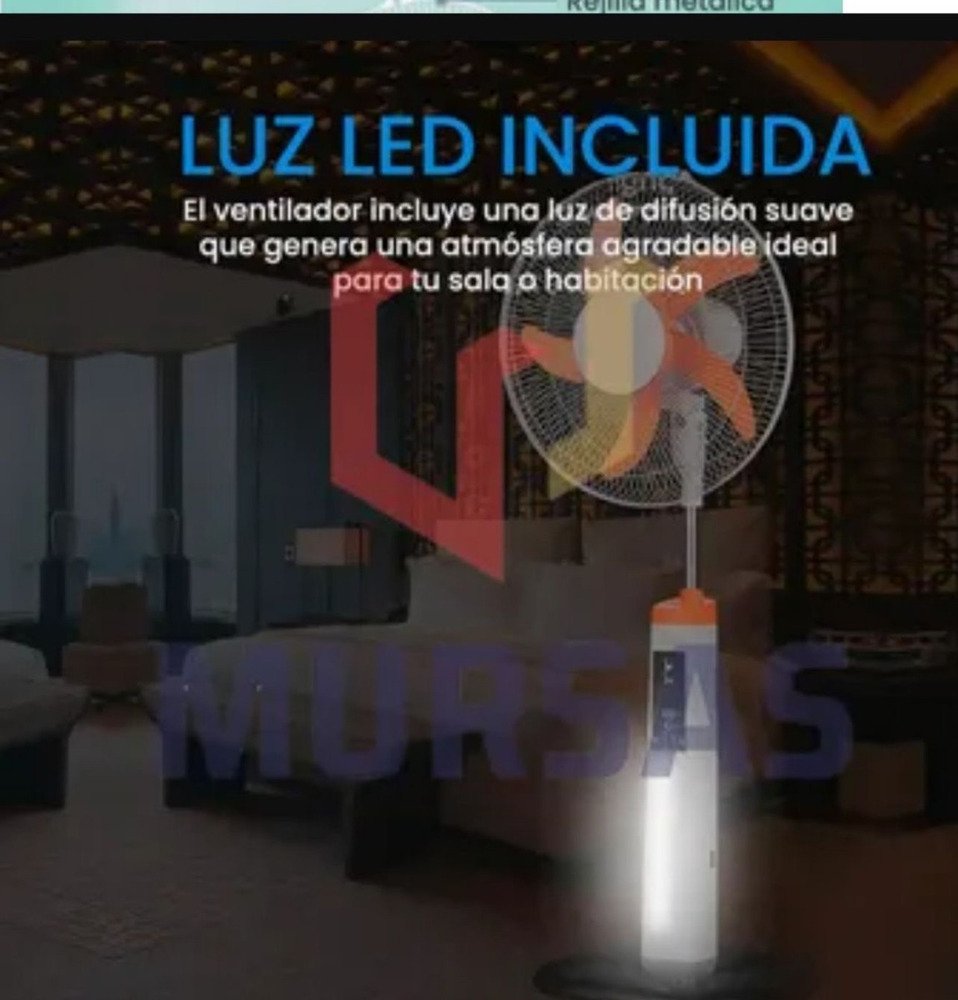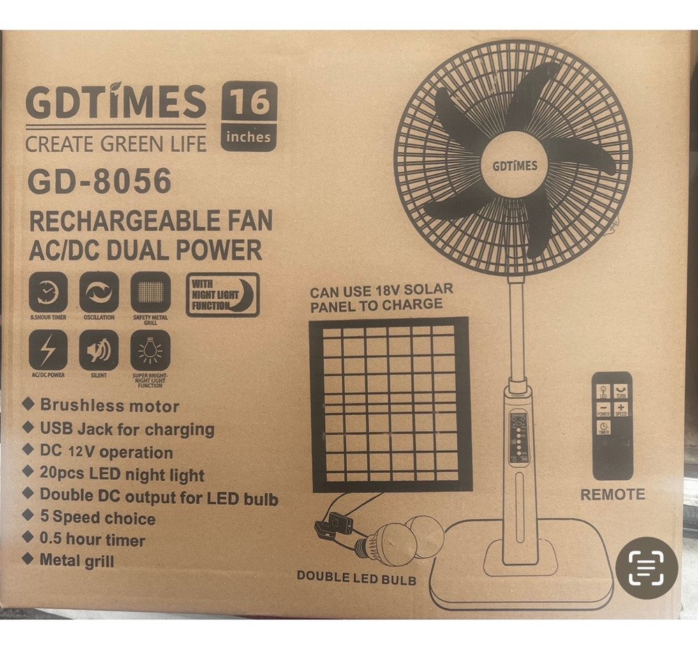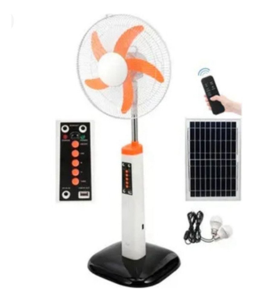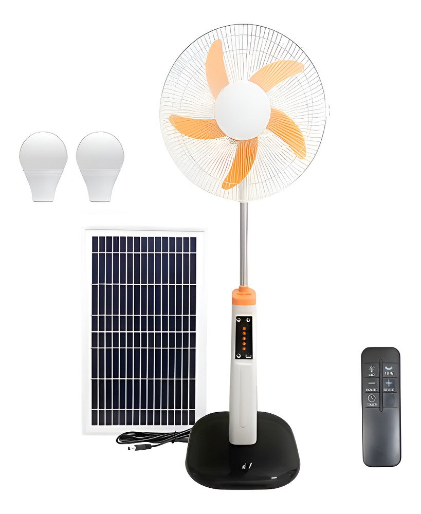 VENTILADOR DE PISO RECARGABLE CON PANEL SOLAR 12V, 5 VELOCIDADES + 2 BOMBILLOS LED + CONTROL REMOTO