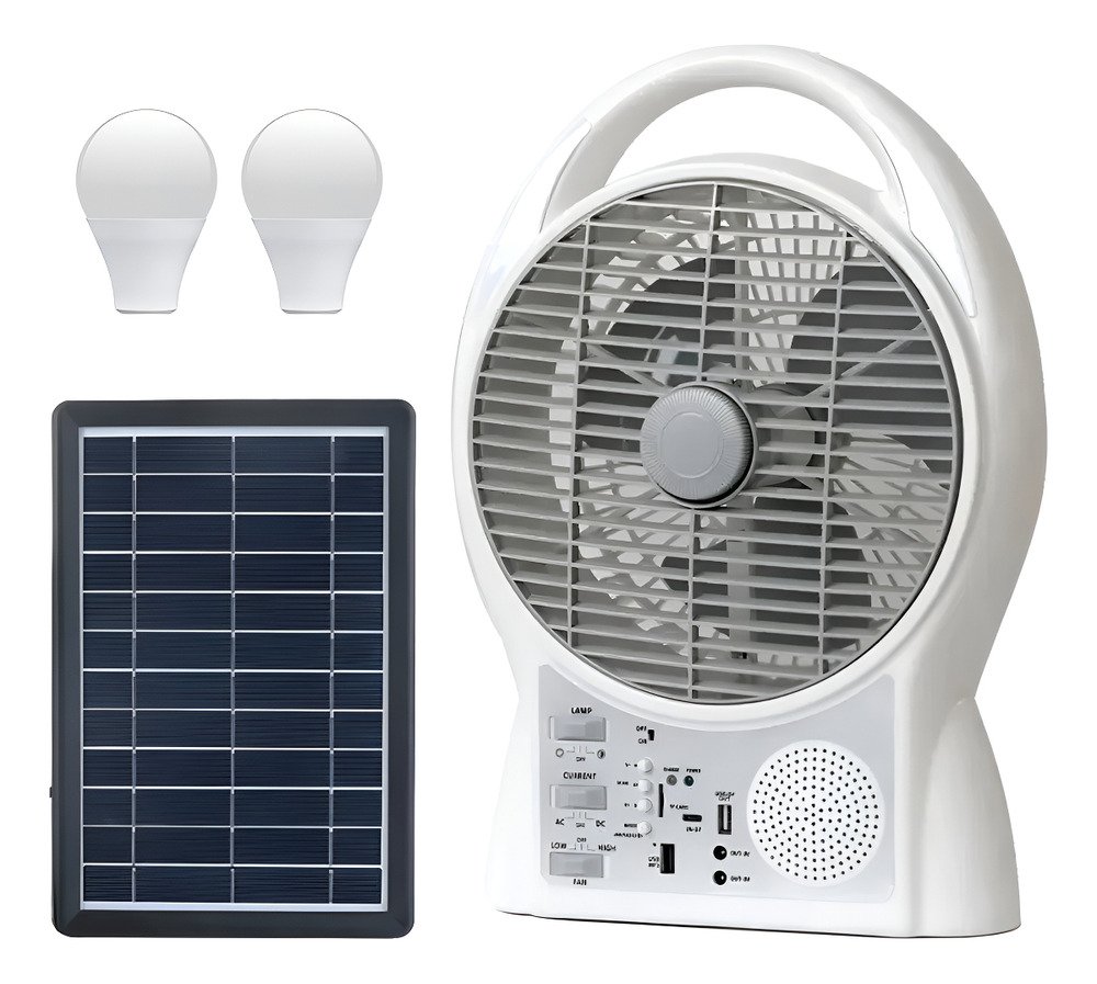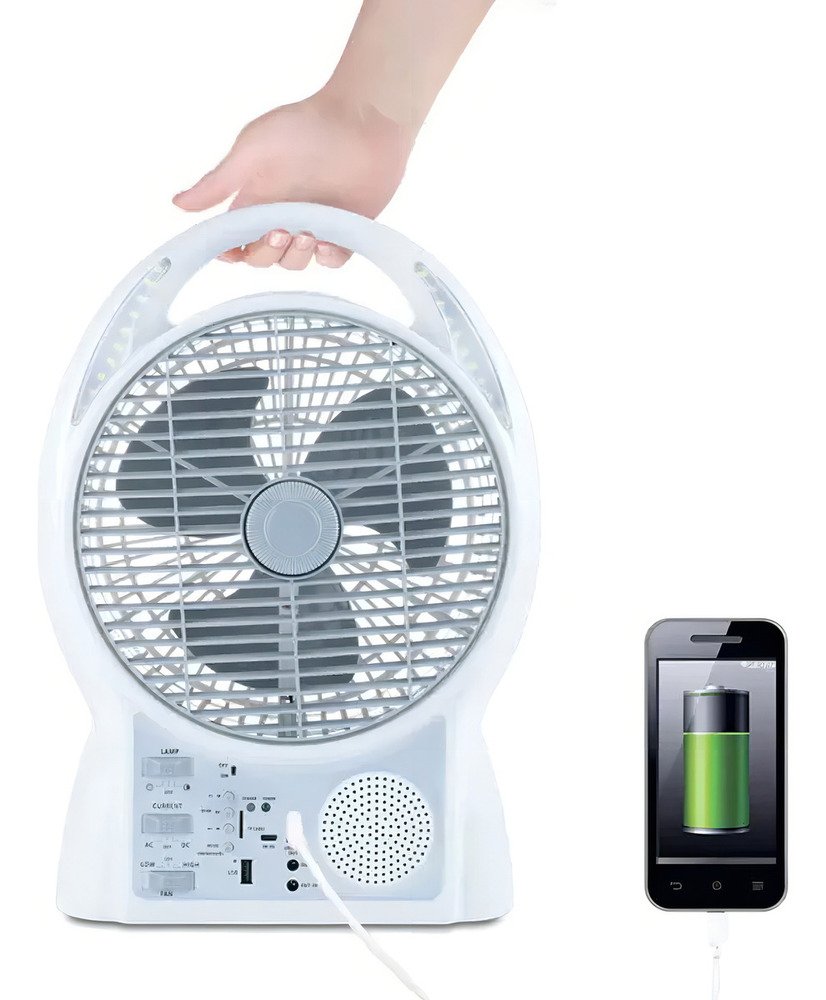 Ventilador Solar 6 En 1: Luz Led, Radio Y Carga Recargable Cantidad De Aspas 2 Aspas Blanco Diámetro 8 Frecuencia Na Material De Las Aspas Plástico 12